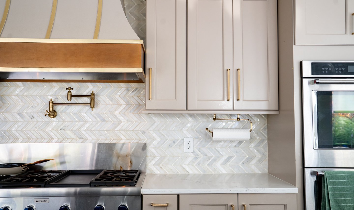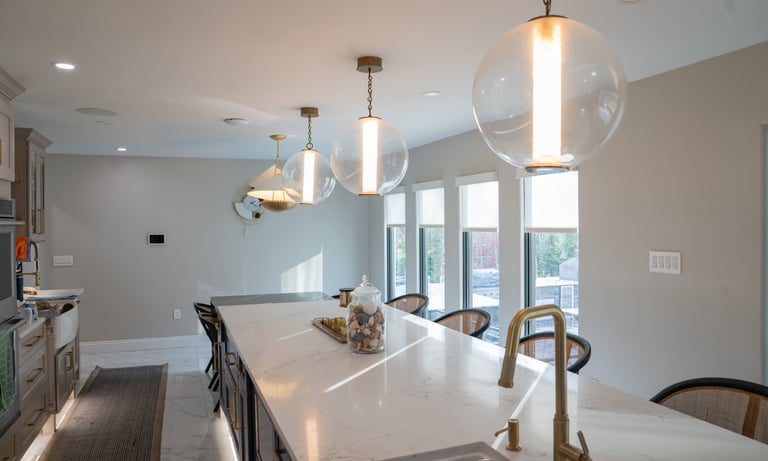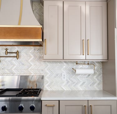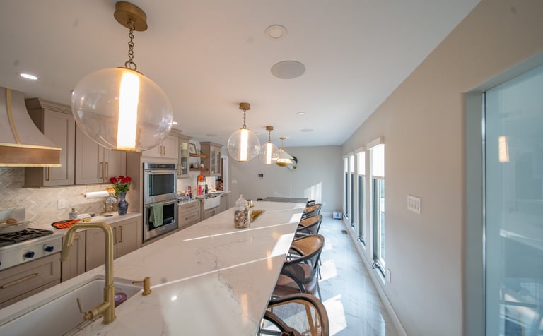This elegant kitchen blends timeless sophistication with modern functionality. Custom ivory cabinetry, brushed brass accents, and a waterfall marble island create a refined focal point, while layered lighting and warm oak flooring add depth and warmth. The result is a polished yet inviting space designed for both everyday living and effortless entertaining.