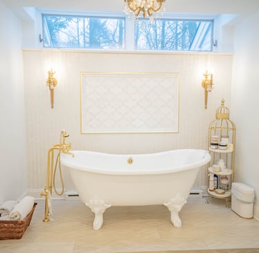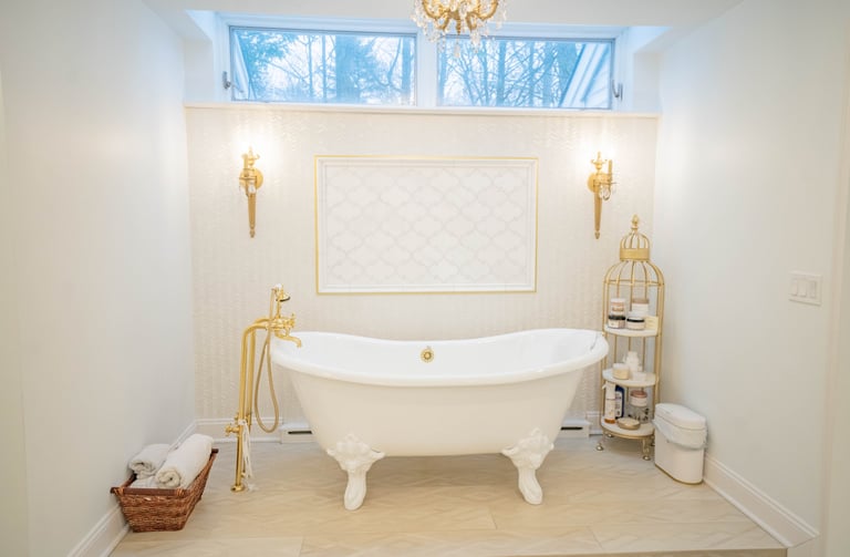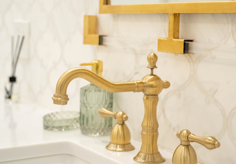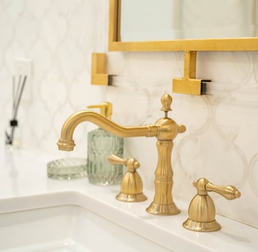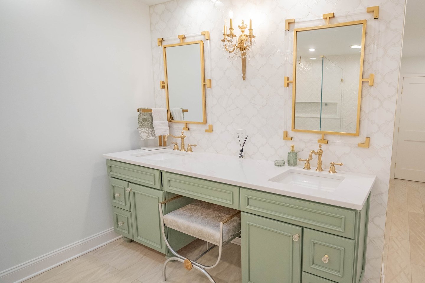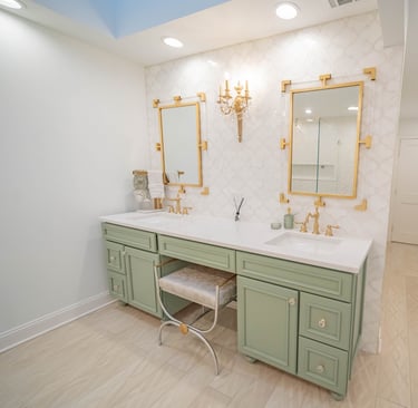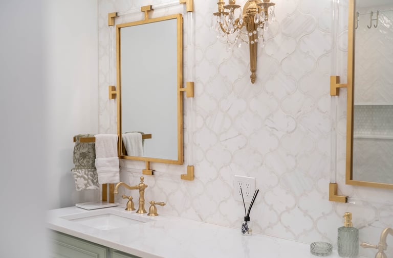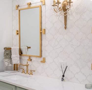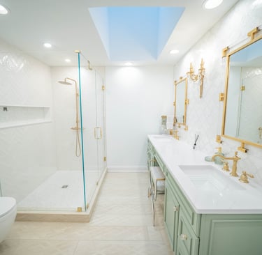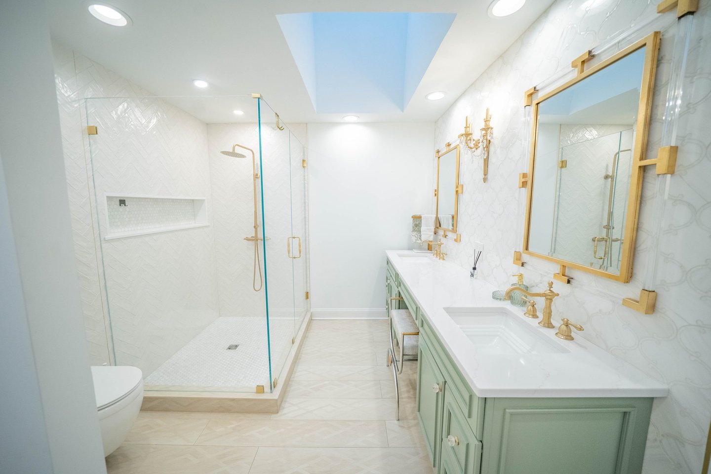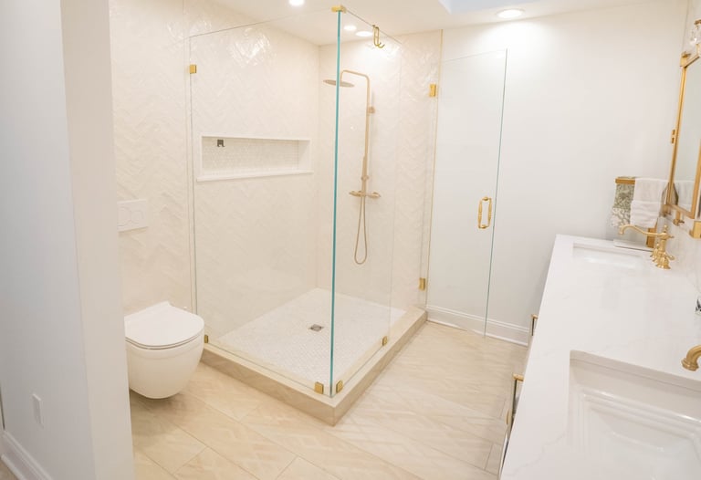 This bathroom showcases modern elegance with white marble finishes, a sleek glass enclosed shower, and a streamlined double vanity. Brushed gold fixtures add warmth and contrast, creating a bright, sophisticated, spa like retreat.