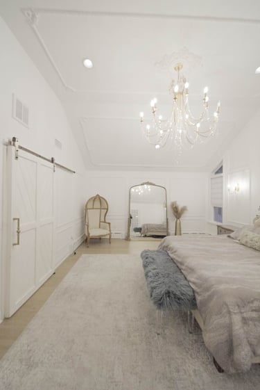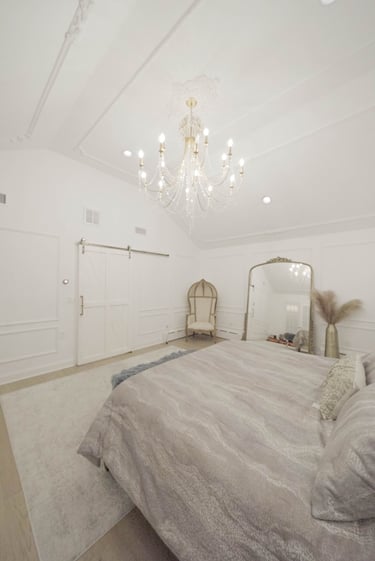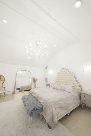 This bedroom showcases a gentle white color scheme complemented by traditional wall paneling, an exquisite chandelier, and a decorative mirror that amplifies brightness and space. Luxurious bedding and elegant furnishings compose a tranquil, timeless environment that is both opulent and welcoming.