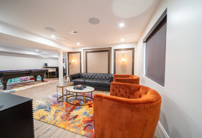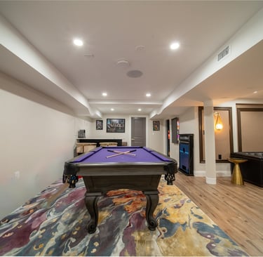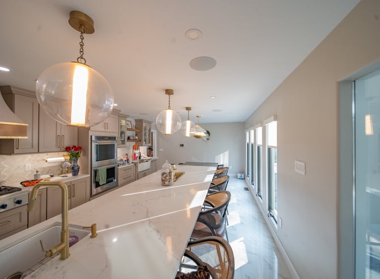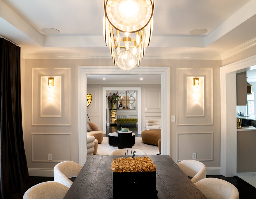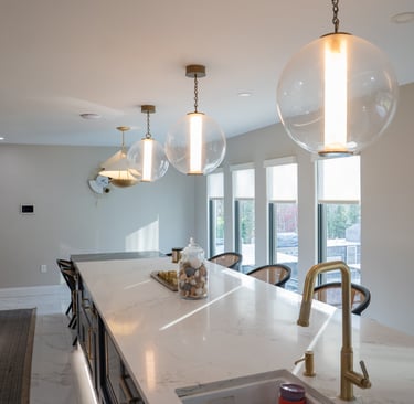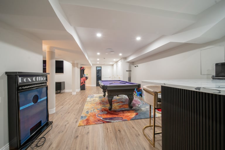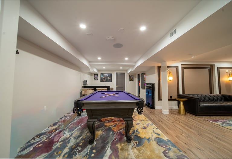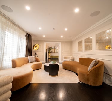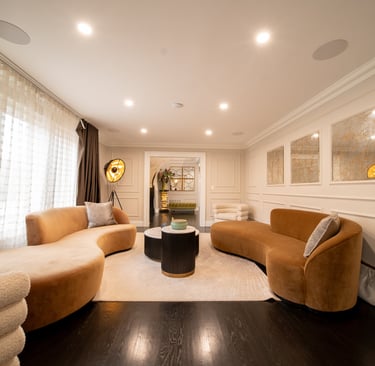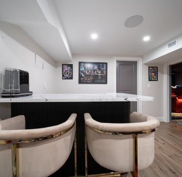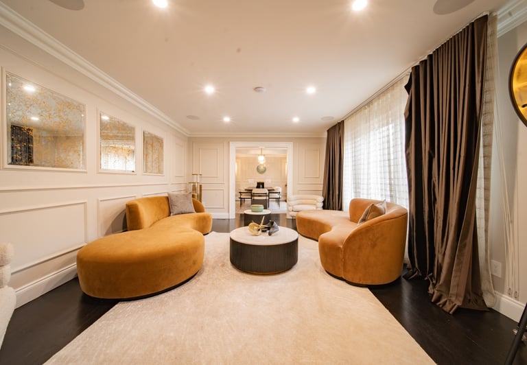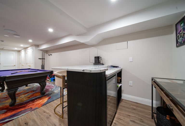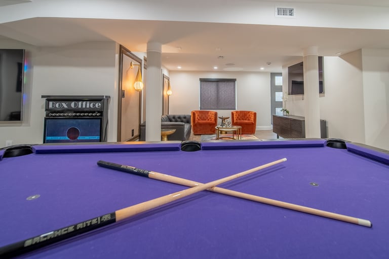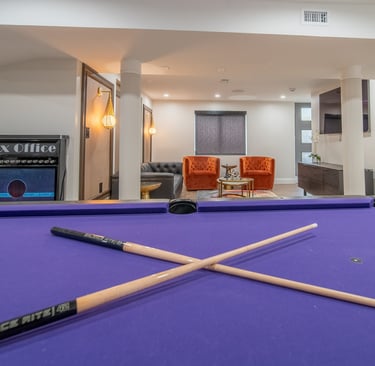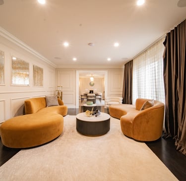 This elegant two story home features a grand circular driveway, a light exterior with a dark roof, and a welcoming arched entryway. Large windows and manicured landscaping enhance its curb appeal, while the spacious backyard offers plenty of room for relaxation and recreation. The cozy lounge offers a sophisticated recreational space. A central pool table encourages social interaction, complemented by refined seating and ambient lighting. The design emphasizes comfort and elegance. The elegant kitchen blends timeless sophistication with modern functionality. Custom ivory cabinetry, brushed brass accents, and a waterfall marble island create a refined focal point, while layered lighting and warm oak flooring add depth and warmth. The result is a polished yet inviting space designed for both everyday living and effortless entertaining.