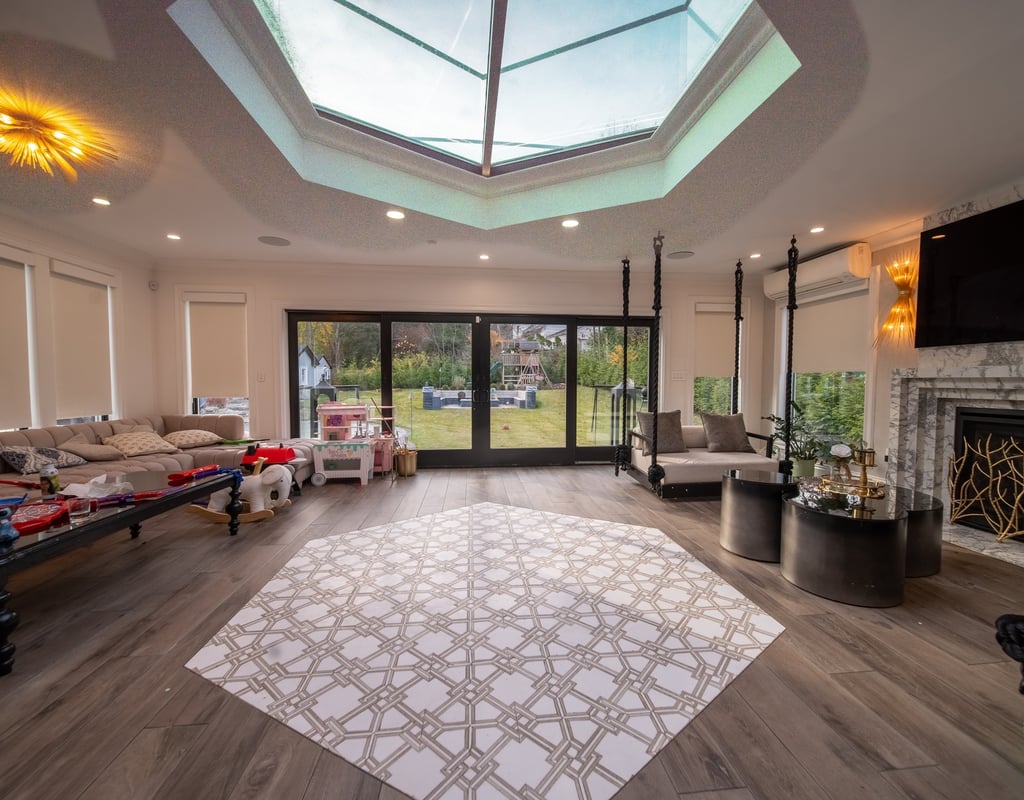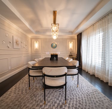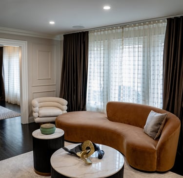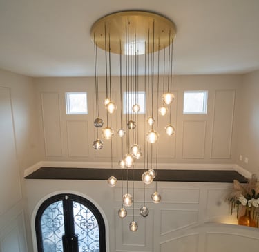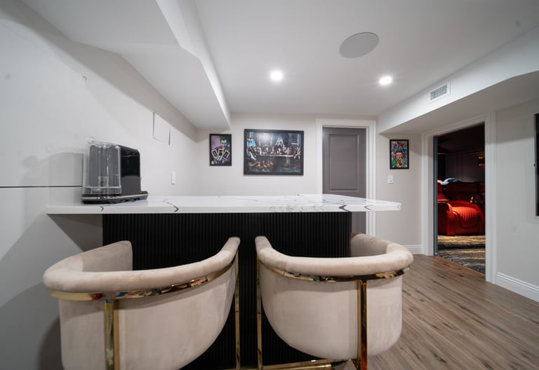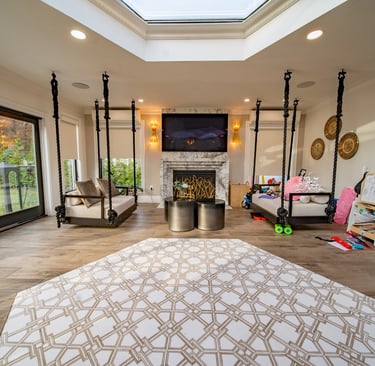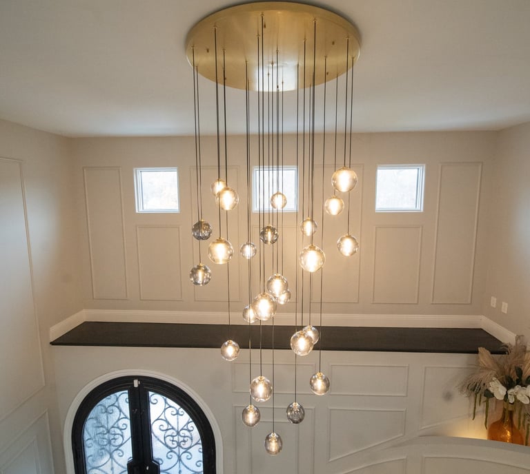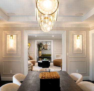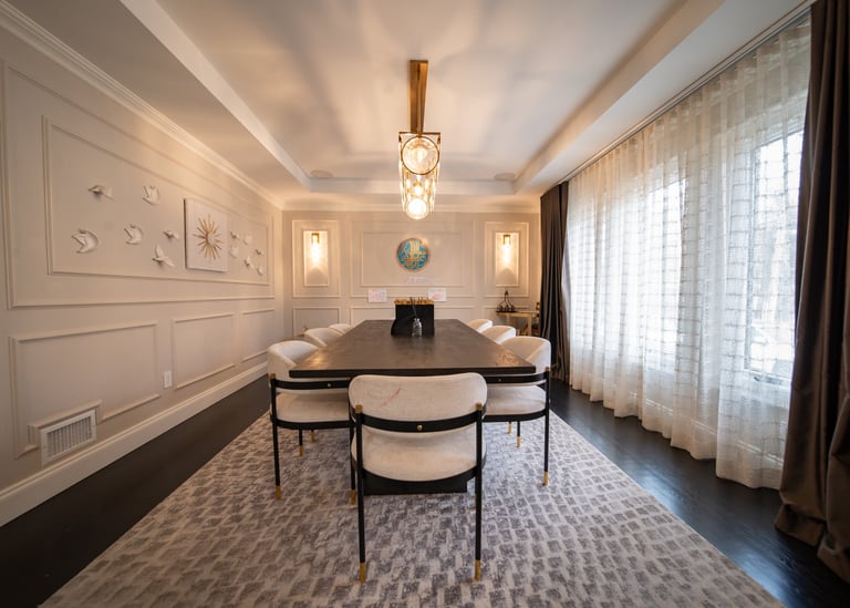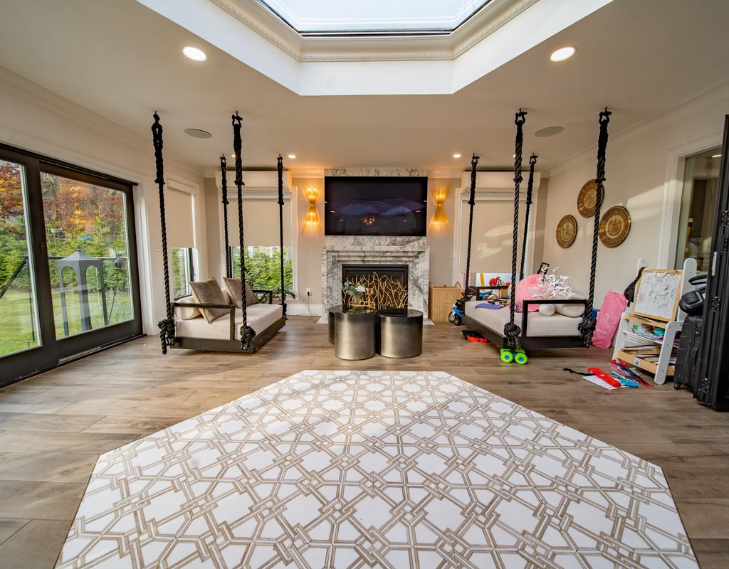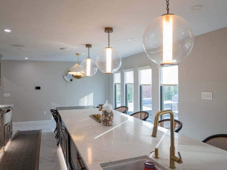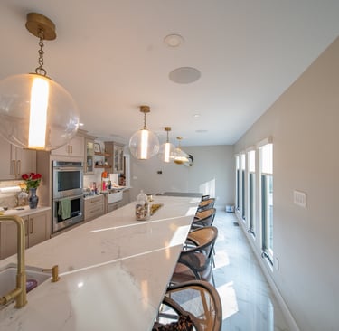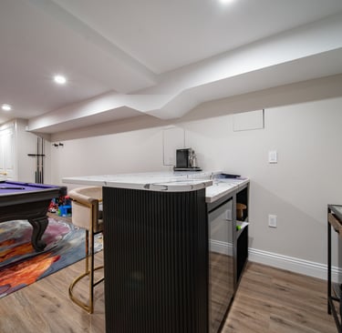 This elegant two story home features a grand circular driveway, a light exterior with a dark roof, and a welcoming arched entryway. Large windows and manicured landscaping enhance its curb appeal, while the spacious backyard offers plenty of room for relaxation and recreation. The cozy lounge offers a sophisticated recreational space. A central pool table encourages social interaction, complemented by refined seating and ambient lighting. The design emphasizes comfort and elegance. The elegant kitchen blends timeless sophistication with modern functionality. Custom ivory cabinetry, brushed brass accents, and a waterfall marble island create a refined focal point, while layered lighting and warm oak flooring add depth and warmth. The result is a polished yet inviting space designed for both everyday living and effortless entertaining.